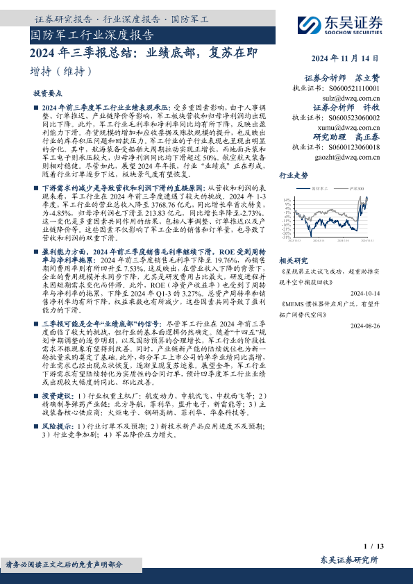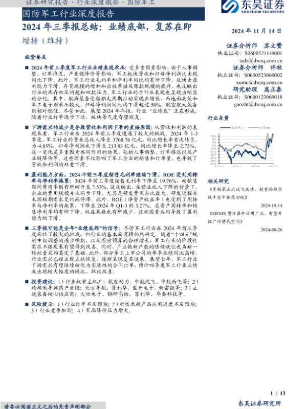 三季报 业绩分析 国防军工 行业复苏 订单延迟