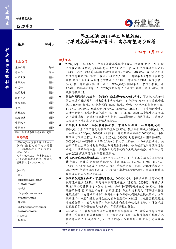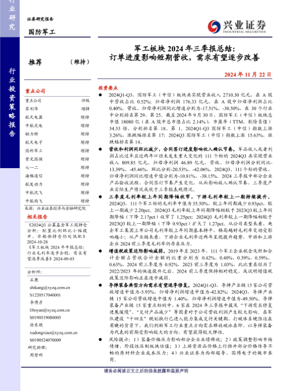 【兴业证券】【20241122】军工板块2024年三季报总结 订单进度影响短期营收,需求有望逐步改善-52页