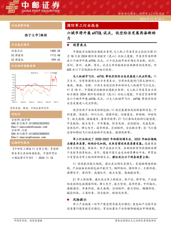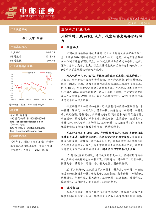 【中邮证券】【20241124】20241124-中邮证券-国防军工行业报告:六城市将开展eVTOL试点,低空经济发展再添新助力-15页