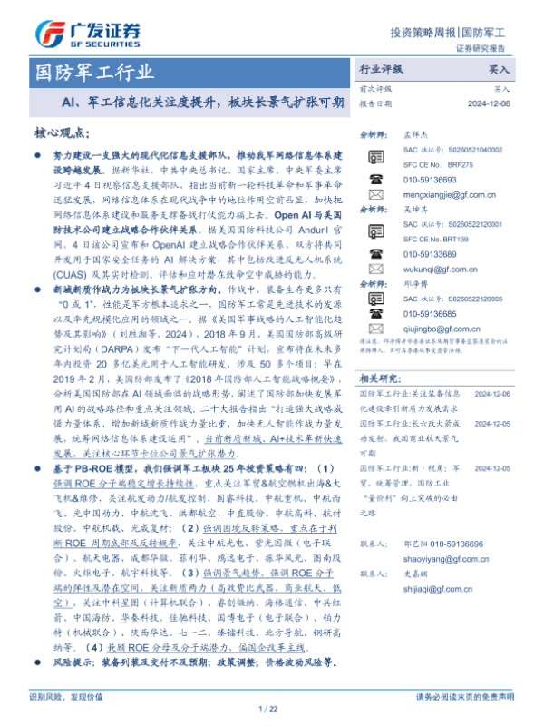 【广发证券】【20241208】20241208-广发证券-国防军工行业投资策略周报:AI、军工信息化关注度提升,板块长景气扩张可期-22页
