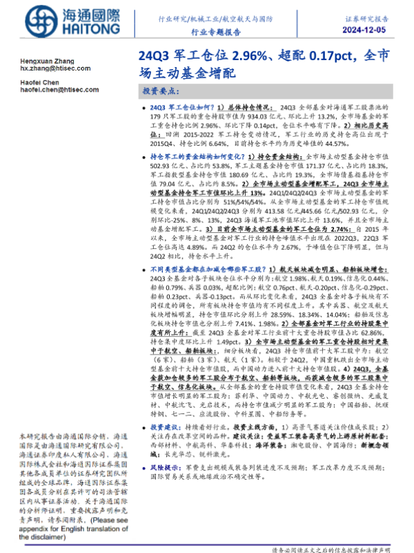 【海通国际】【20241205】24Q3军工仓位2.96%、超配0.17pct,全市场主动基金增配-22页