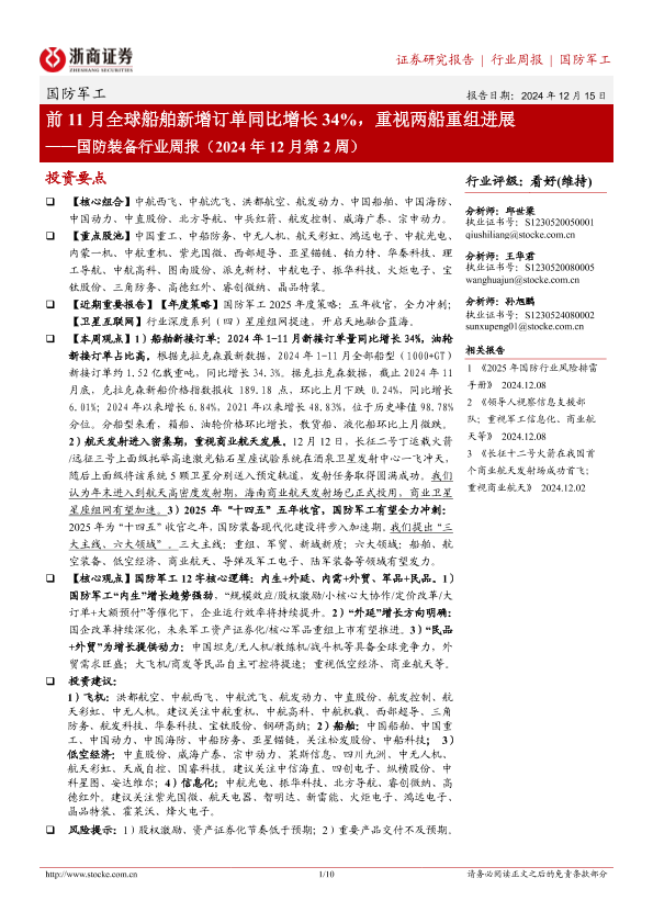 【浙商证券】【20241215】国防装备行业周报(2024年12月第2周):前11月全球船舶新增订单同比增长34%,重视两船重组进展-10页