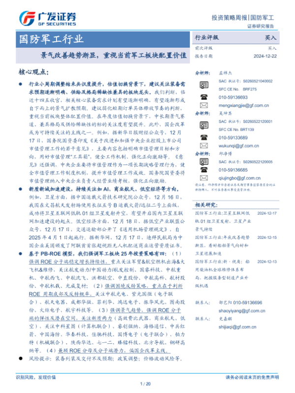 【广发证券】【20241222】国防军工行业投资策略周报:景气改善趋势渐显,重视当前军工板块配置价值-20页
