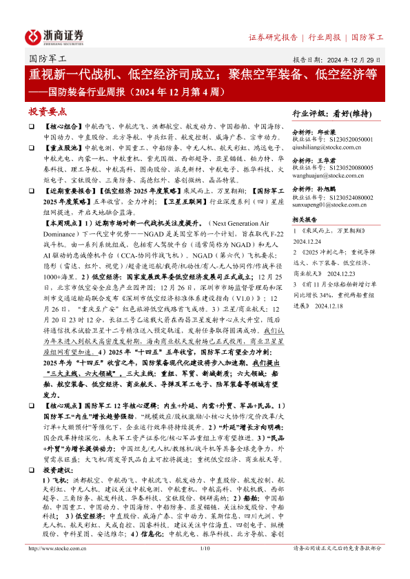 【浙商证券】【20241229】国防装备行业周报(2024年12月第4周):重视新一代战机、低空经济司成立;聚焦空军装备、低空经济等-10页