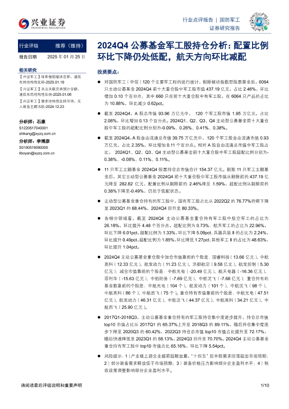 【兴业证券】【20250125】2024Q4公募基金军工股持仓分析:配置比例环比下降仍处低配,航天方向环比减配-10页