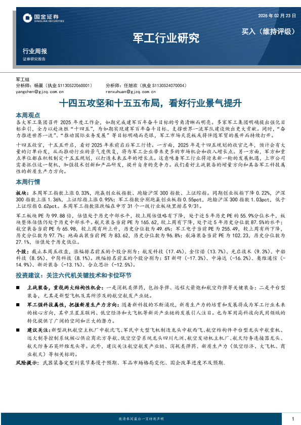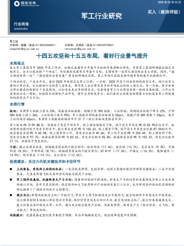 【国金证券】【20250223】20250223-国金证券-军工行业研究:十四五攻坚和十五五布局,看好行业景气提升-16页