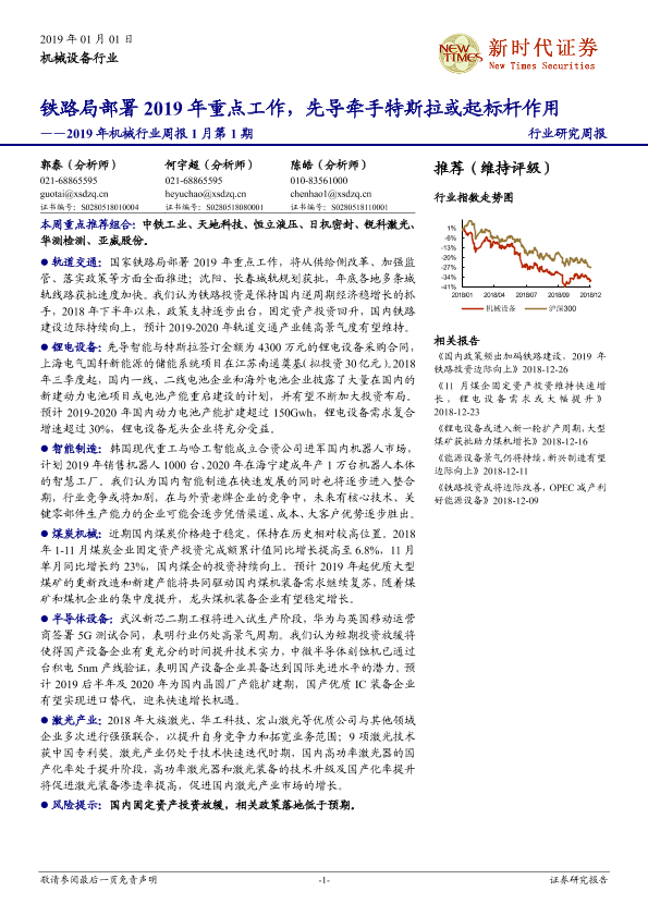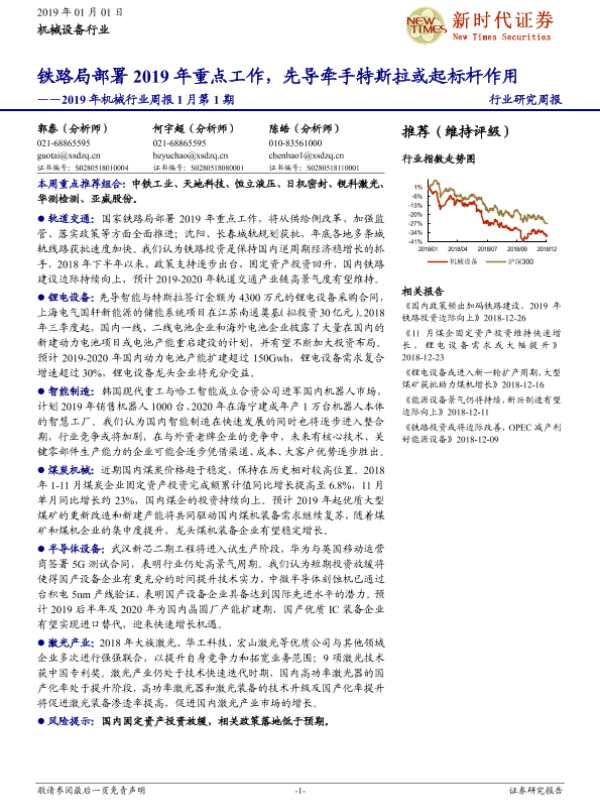 【新时代证券】【20190101】2019年机械行业周报1月第1期:铁路局部署2019年重点工作,先导牵手特斯拉或起标杆作用-17页