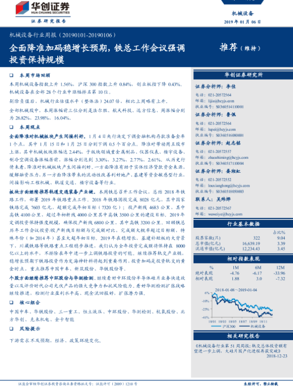【华创证券】【20190106】20190106-华创证券-机械设备行业周报:全面降准加码稳增长预期,铁总工作会议强调投资保持规模-14页