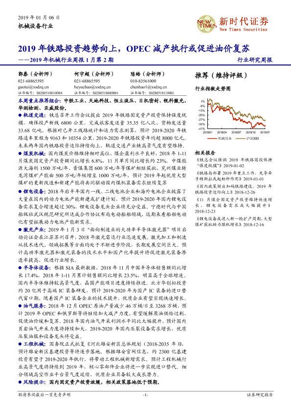 【新时代证券】【20190106】2019年机械行业周报1月第2期:2019年铁路投资趋势向上,OPEC减产执行或促进油价复苏-15页
