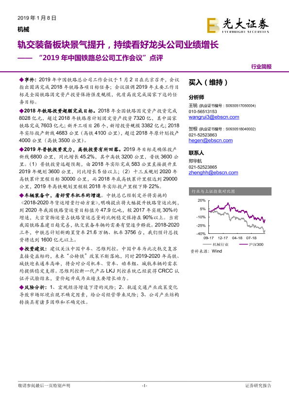 【光大证券】【20190108】机械行业简报:“2019年中国铁路总公司工作会议”点评-轨交装备板块景气提升,持续看好龙头公司业绩增长-3页