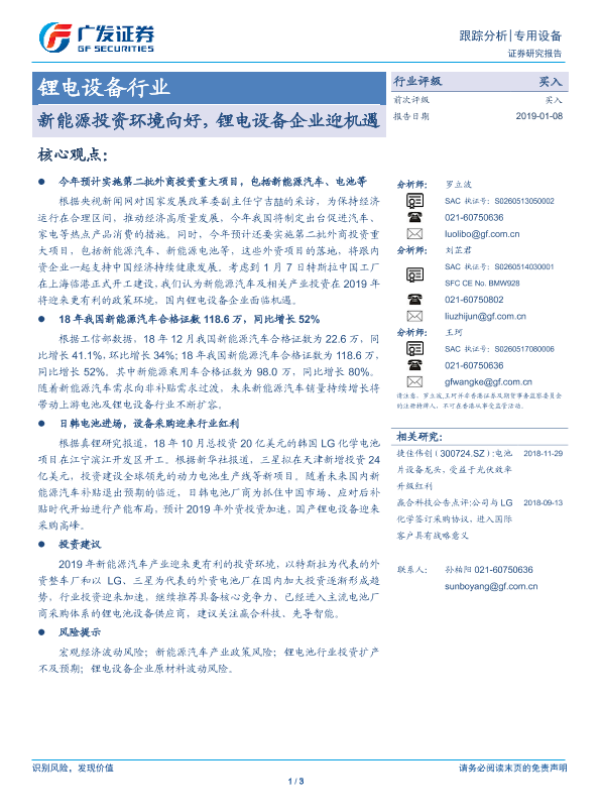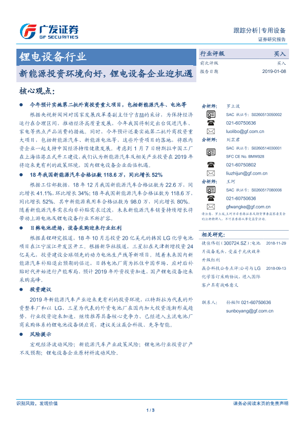 【广发证券】【20190108】锂电设备行业跟踪分析:新能源投资环境向好,锂电设备企业迎机遇-3页