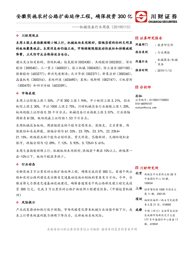 【川财证券】【20190113】机械设备行业周报:安徽实施农村公路扩面延伸工程,确保投资300亿-8页