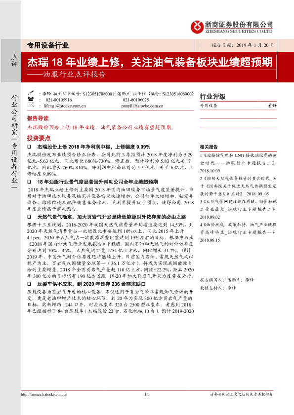 【浙商证券】【20190120】20190120-浙商证券-油服行业点评报告:杰瑞18年业绩上修,关注油气装备板块业绩超预期-3页