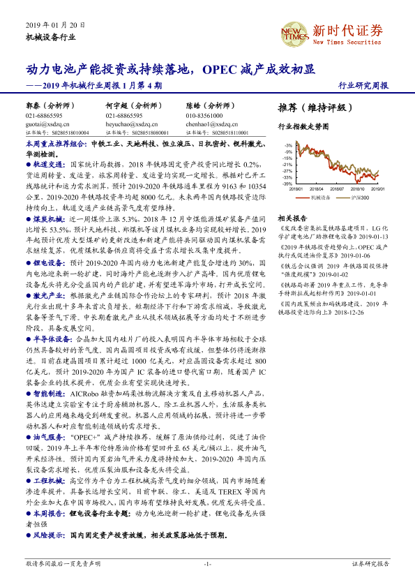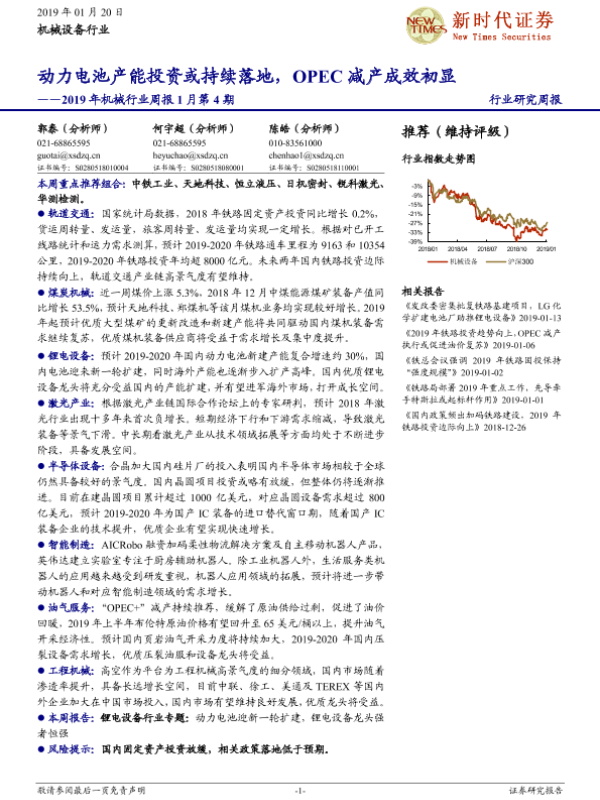 【新时代证券】【20190120】2019年机械行业周报1月第4期:动力电池产能投资或持续落地,OPEC减产成效初显-15页