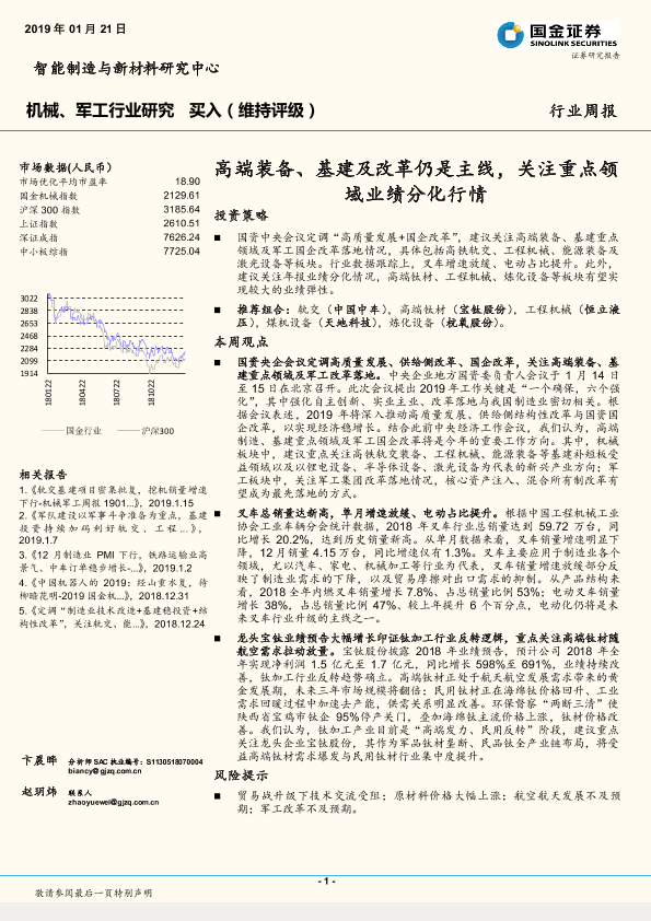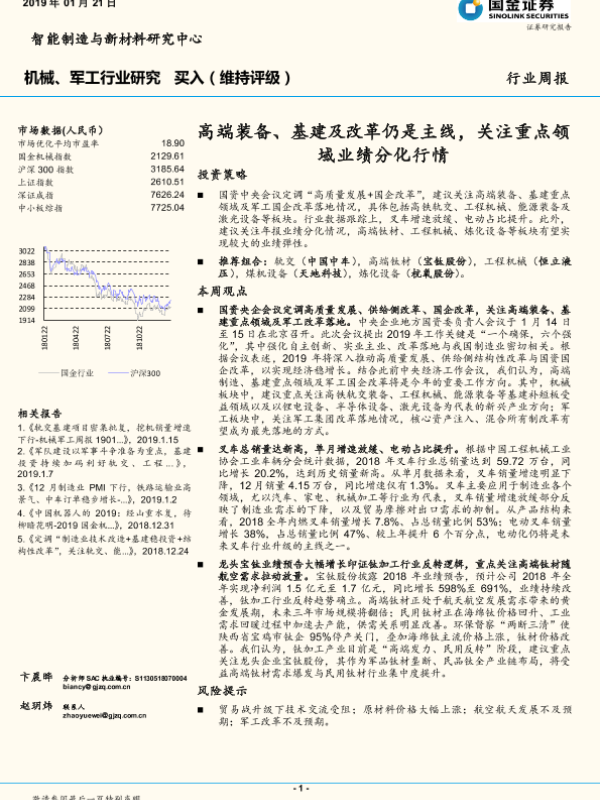 【国金证券】【20190121】20190121-国金证券-机械、军工行业研究:高端装备、基建及改革仍是主线,关注重点领域业绩分化行情-13页