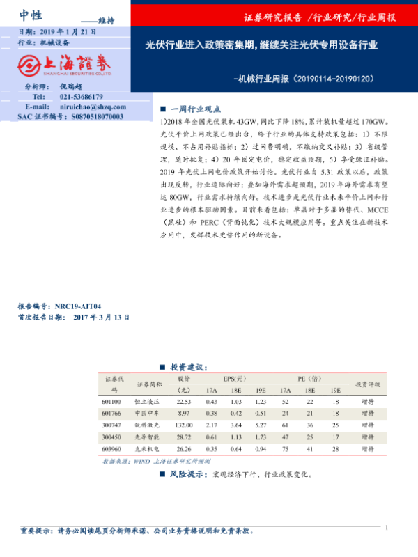 【上海证券】【20190121】机械行业周报:光伏行业进入政策密集期,继续关注光伏专用设备行业-6页