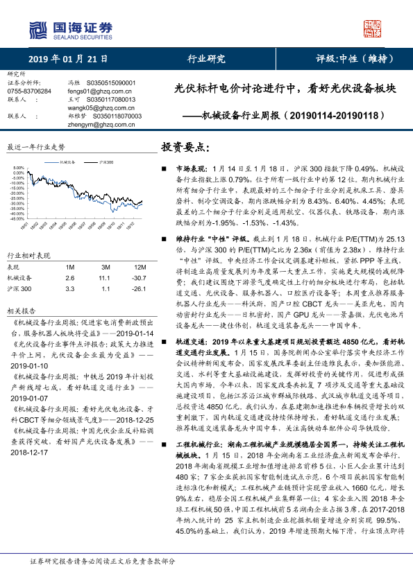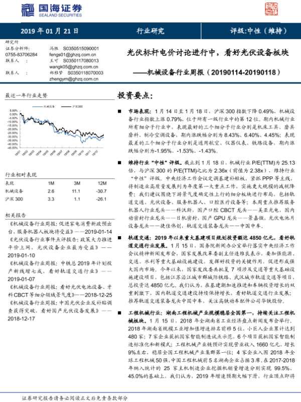 【国海证券】【20190121】20190121-国海证券-机械设备行业周报:光伏标杆电价讨论进行中,看好光伏设备板块-24页