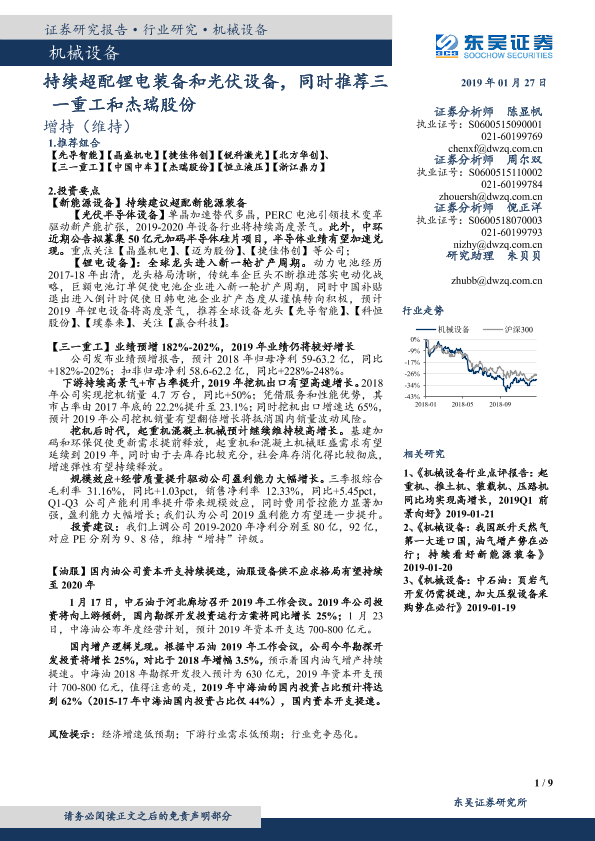 【东吴证券】【20190127】机械设备:持续超配锂电装备和光伏设备,同时推荐三一重工和杰瑞股份-9页