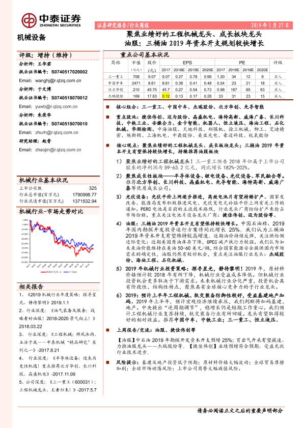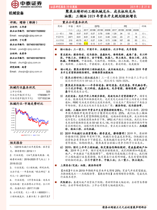 【中泰证券】【20190127】20190127-中泰证券-机械设备行业周报:聚焦业绩好的工程机械龙头、成长板块龙头-油服:三桶油2019年资本开支规划较快增长-15页