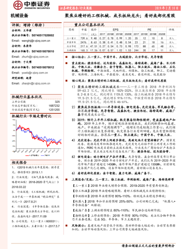 【中泰证券】【20190210】20190210-中泰证券-机械设备行业周报:聚焦业绩好的工程机械、成长板块龙头;看好底部优质股-20页