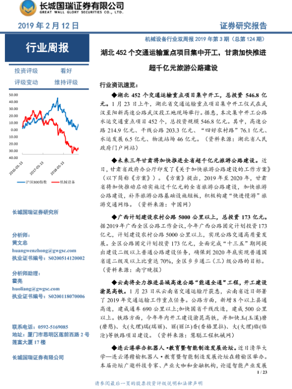 【长城国瑞证券】【20190212】机械设备行业双周报2019年第3期(总第124期):湖北452个交通运输重点项目集中开工,甘肃加快推进超千亿元旅游公路建设-23页