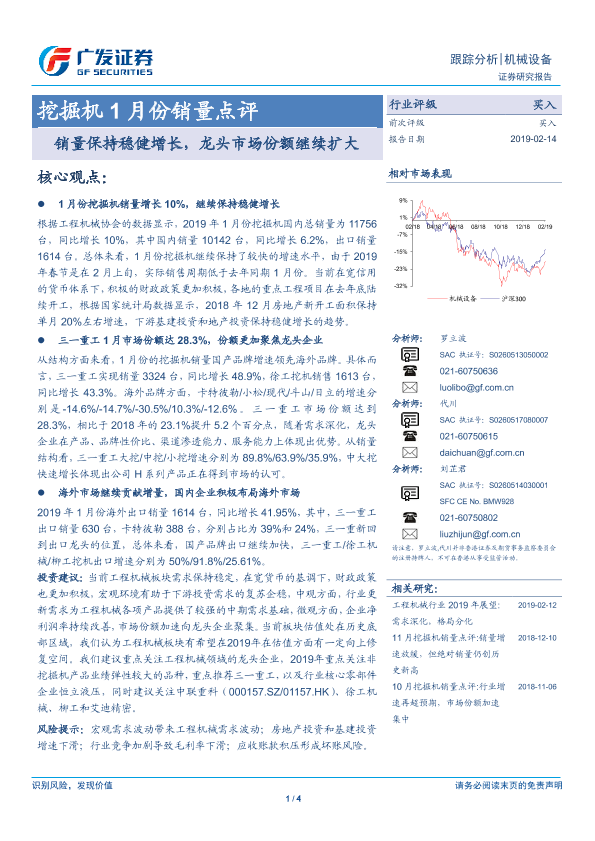 【广发证券】【20190214】挖掘机1月份销量点评:销量保持稳健增长,龙头市场份额继续扩大-4页