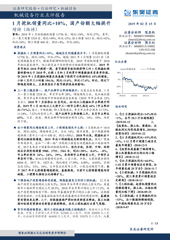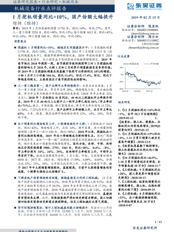 【东吴证券】【20190215】机械设备行业点评报告:1月挖机销量同比+10%,国产份额大幅提升-13页