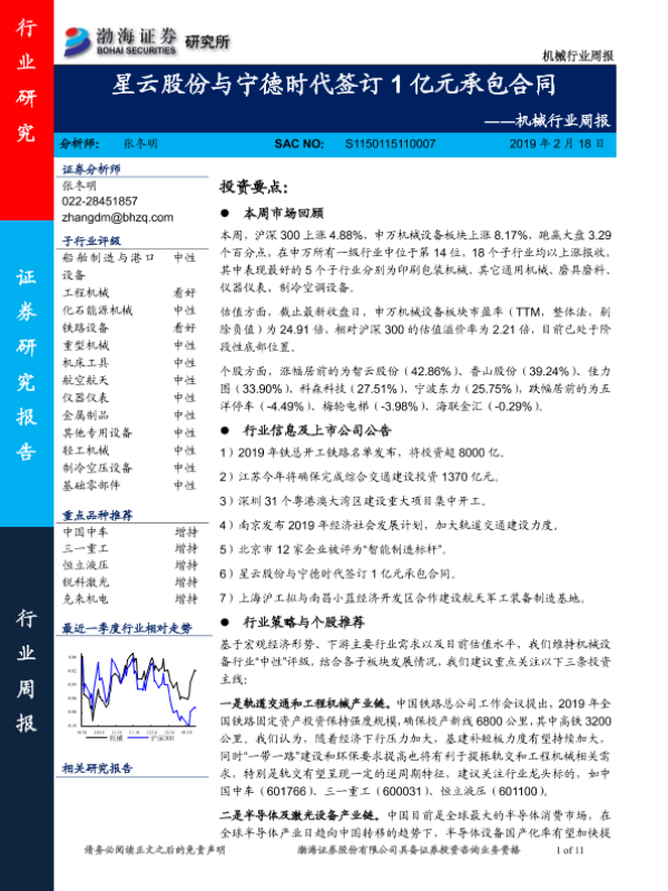 【渤海证券】【20190218】机械行业周报:星云股份与宁德时代签订1亿元承包合同-11页