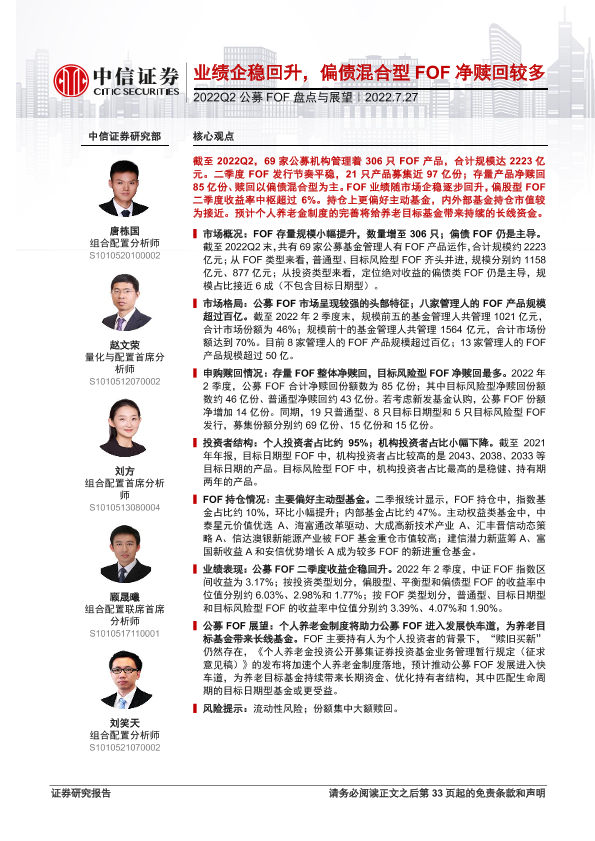 【中信证券】【20220727】2022Q2公募FOF盘点与展望:业绩企稳回升,偏债混合型FOF净赎回较多-34页