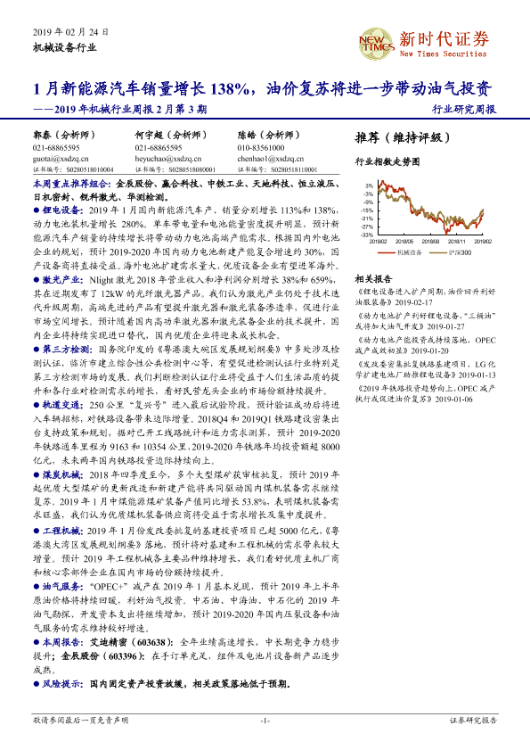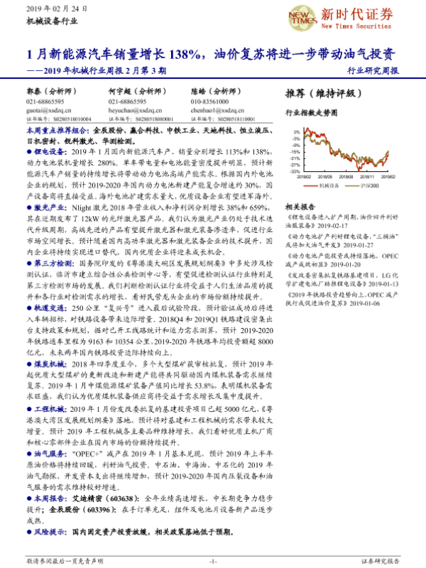 【新时代证券】【20190224】2019年机械行业周报2月第3期:1月新能源汽车销量增长138%,油价复苏将进一步带动油气投资-19页
