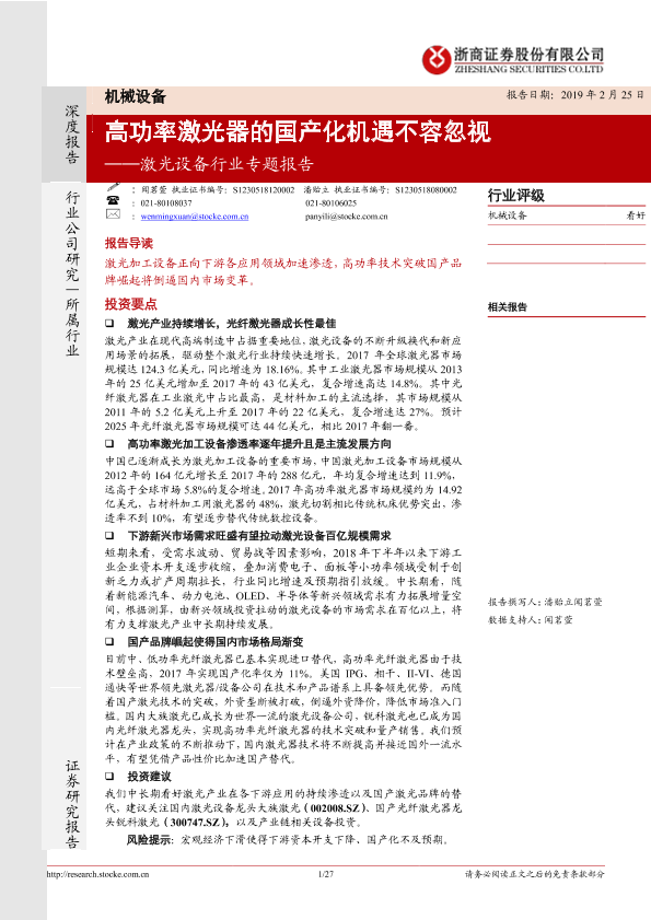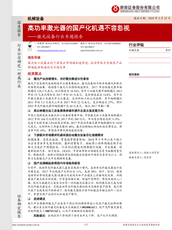 【浙商证券】【20190225】20190225-浙商证券-机械设备激光设备行业专题报告:高功率激光器的国产化机遇不容忽视-27页
