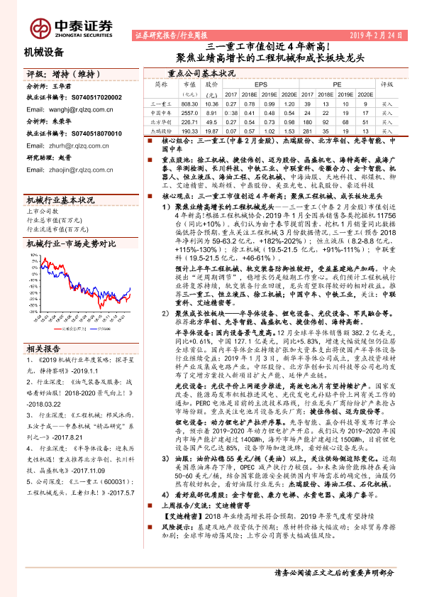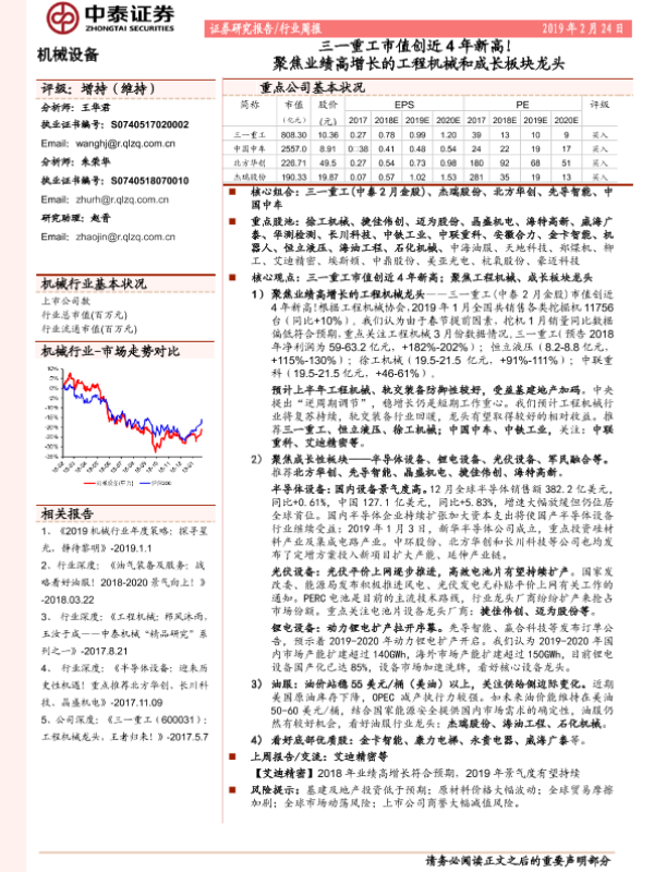 【中泰证券】【20190224】20190224-中泰证券-机械设备行业周报:聚焦业绩高增长的工程机械和成长板块龙头-三一重工市值创近4年新高!-15页