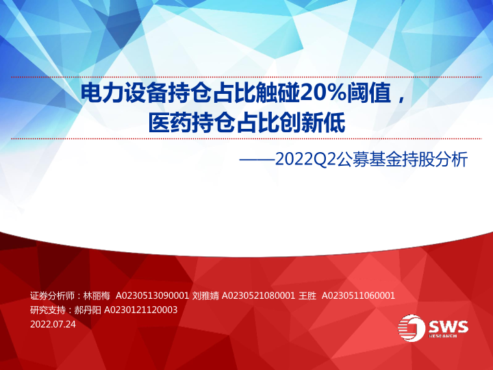 【申万宏源】【20220724】2022Q2公募基金持股分析:电力设备持仓占比触碰20%阈值,医药持仓占比创新低-51页