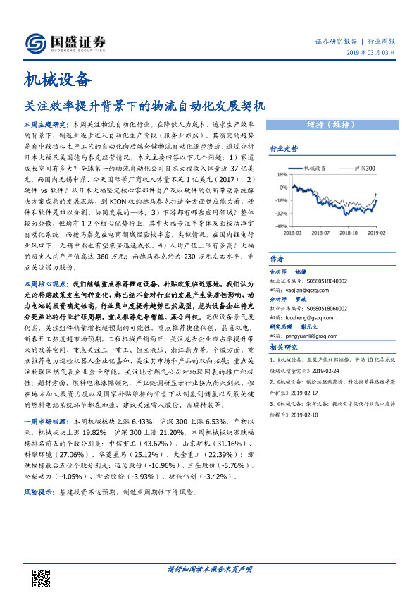 【国盛证券】【20190303】20190303-国盛证券-机械设备行业周报:关注效率提升背景下的物流自动化发展契机-19页
