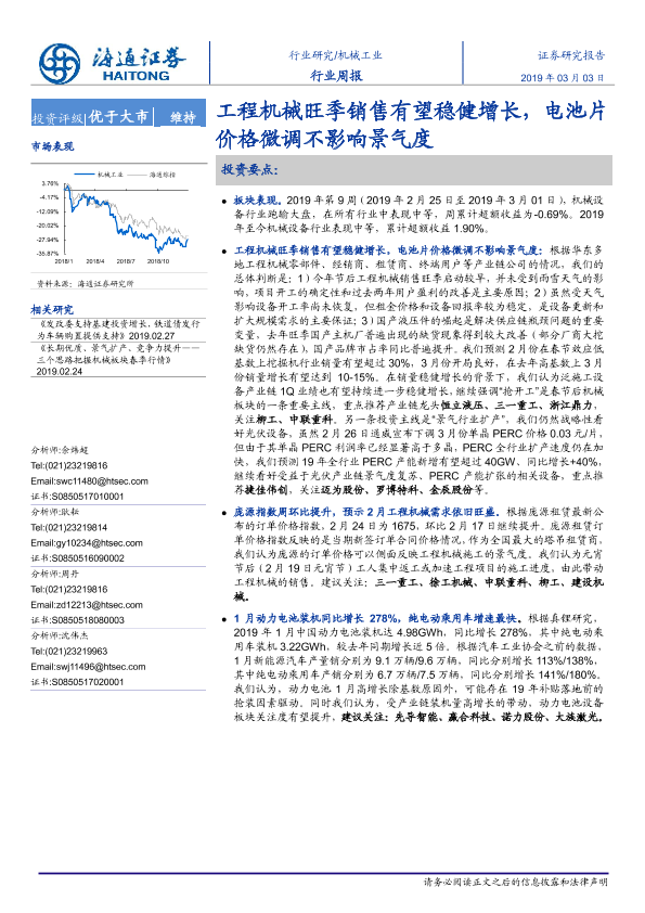 【海通证券】【20190303】20190303-海通证券-机械工业行业周报:工程机械旺季销售有望稳健增长,电池片价格微调不影响景气度-16页