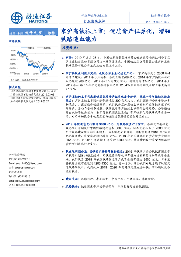 【海通证券】【20190304】机械工业行业信息点评:京沪高铁拟上市:优质资产证券化,增强铁路造血能力-5页