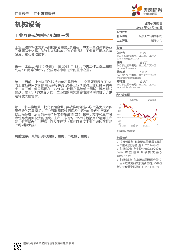 【天风证券】【20190305】机械设备行业研究周报:工业互联或为科技浪潮新主线-6页