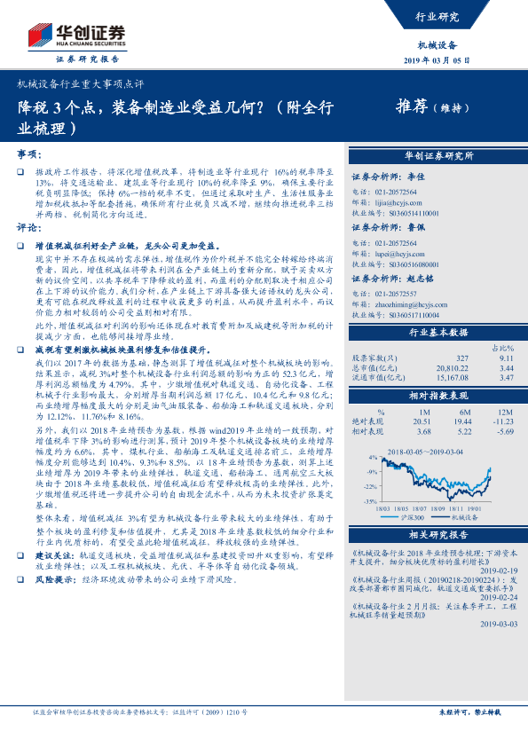 【华创证券】【20190305】机械设备行业重大事项点评:降税3个点,装备制造业受益几何?(附全行业梳理)-10页