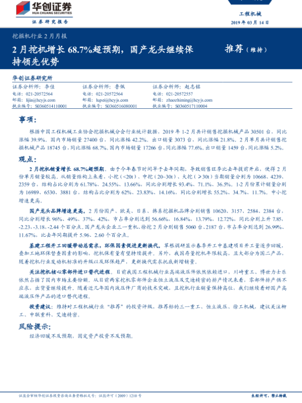 【华创证券】【20190314】20190314-华创证券-挖掘机行业2月月报:2月挖机增长68.7%超预期,国产龙头继续保持领先优势-8页