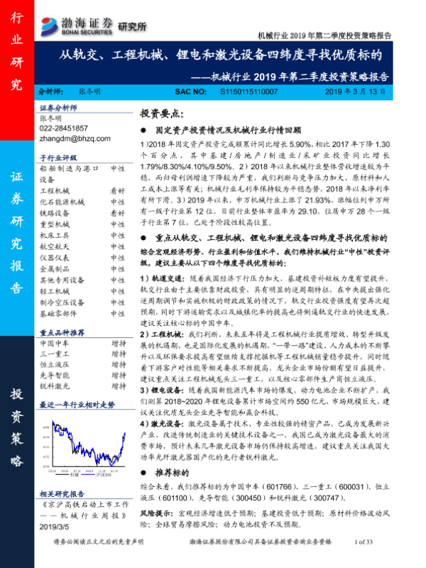 【渤海证券】【20190313】机械行业2019年第二季度投资策略报告:从轨交、工程机械、锂电和激光设备四纬度寻找优质标的-33页