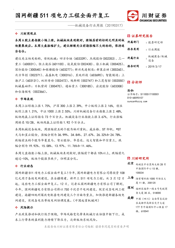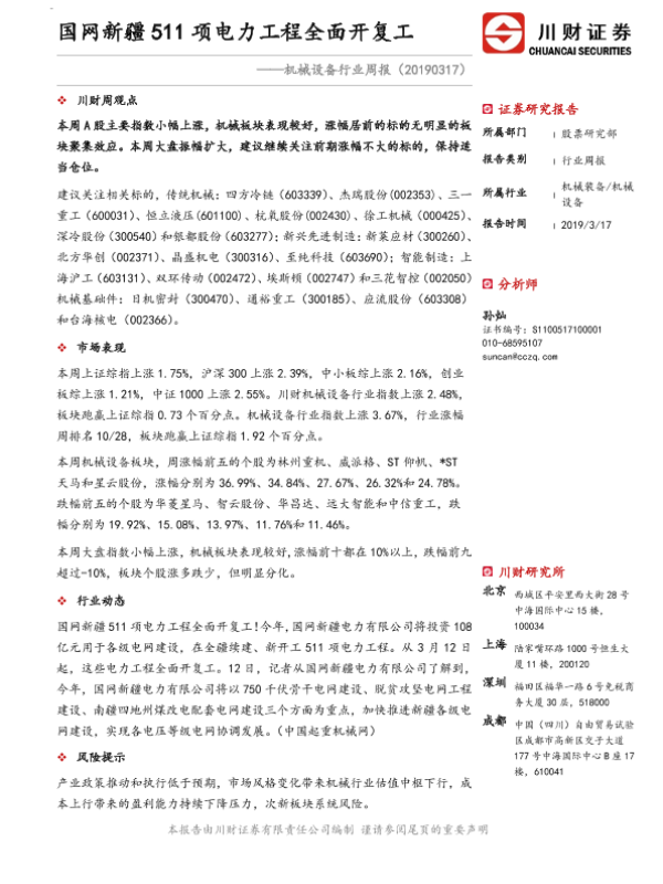 【川财证券】【20190317】机械设备行业周报:国网新疆511项电力工程全面开复工-8页