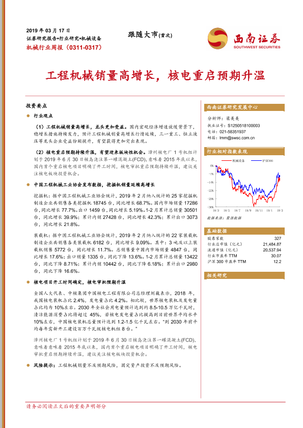 【西南证券】【20190317】机械行业周报:工程机械销量高增长,核电重启预期升温-12页