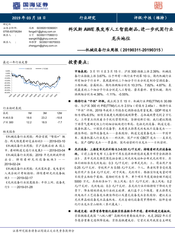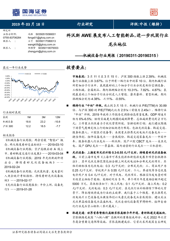 【国海证券】【20190318】20190318-国海证券-机械设备行业周报:科沃斯AWE展发布人工智能新品,进一步巩固行业龙头地位-24页