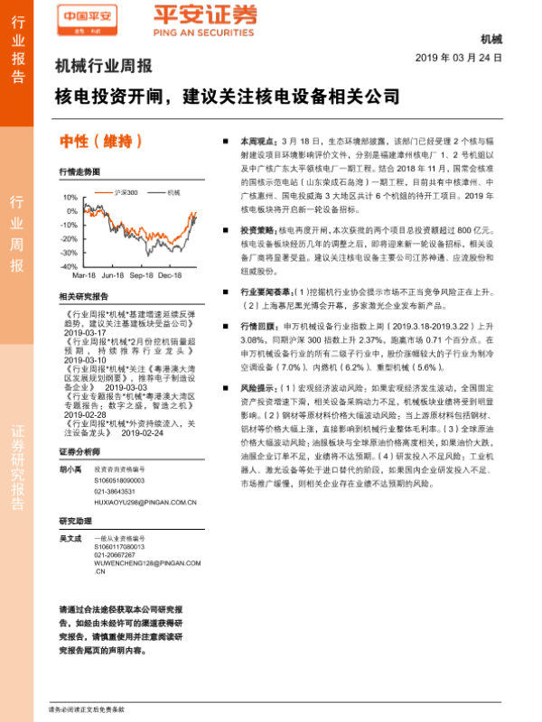 【平安证券】【20190324】机械行业周报:核电投资开闸,建议关注核电设备相关公司-4页