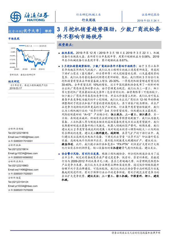 【海通证券】【20190324】20190324-海通证券-机械工业行业周报:3月挖机销量趋势强劲,少数厂商放松条件不影响市场秩序-10页
