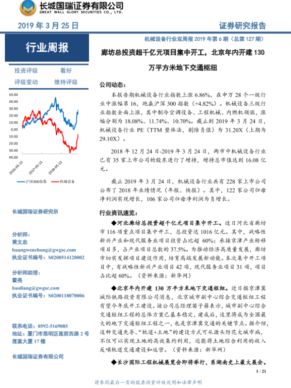 【长城国瑞证券】【20190325】20190325-长城国瑞证券-机械设备行业双周报:廊坊总投资超千亿元项目集中开工,北京年内开建130万平方米地下交通枢纽-21页