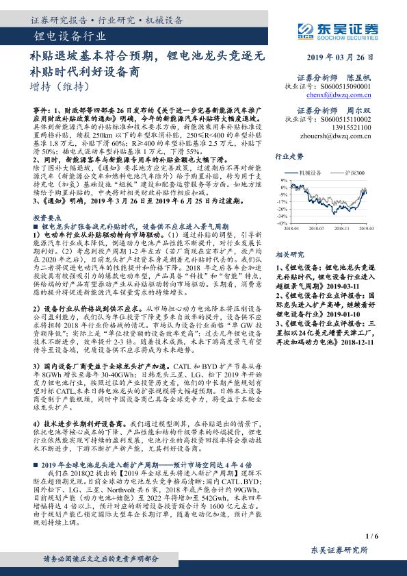 【东吴证券】【20190326】锂电设备行业:补贴退坡基本符合预期,锂电池龙头竞逐无补贴时代利好设备商-6页