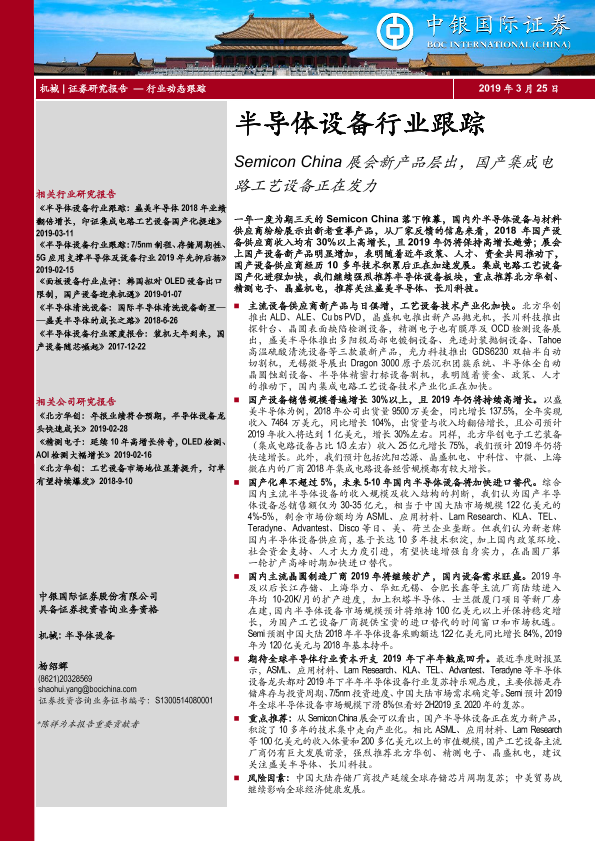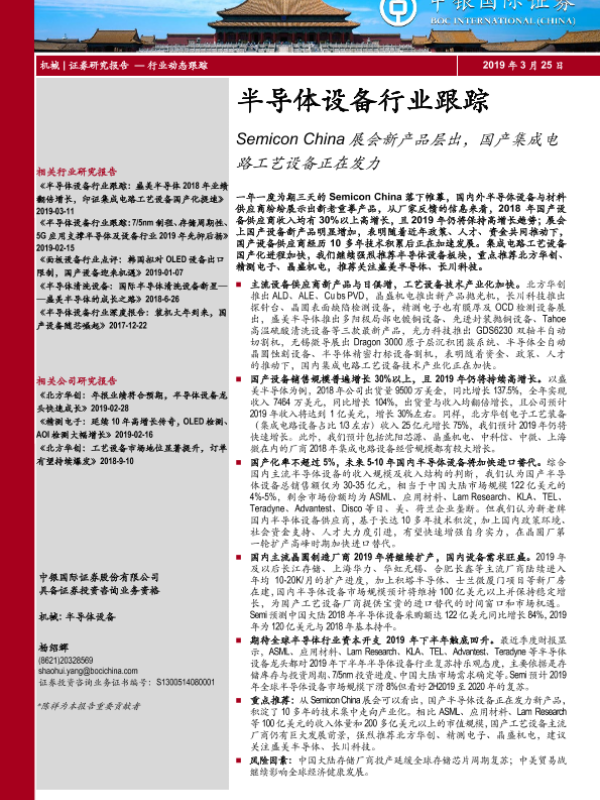 【中银证券】【20190325】半导体设备行业跟踪:Semicon China展会新产品层出,国产集成电路工艺设备正在发力-8页