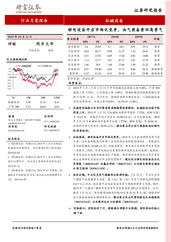 【财信证券】【20190331】20190331-财信证券-机械设备行业月度报告:锂电设备开启市场化竞争,油气装备重回高景气-16页