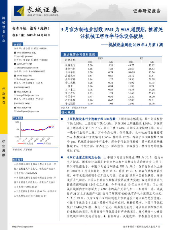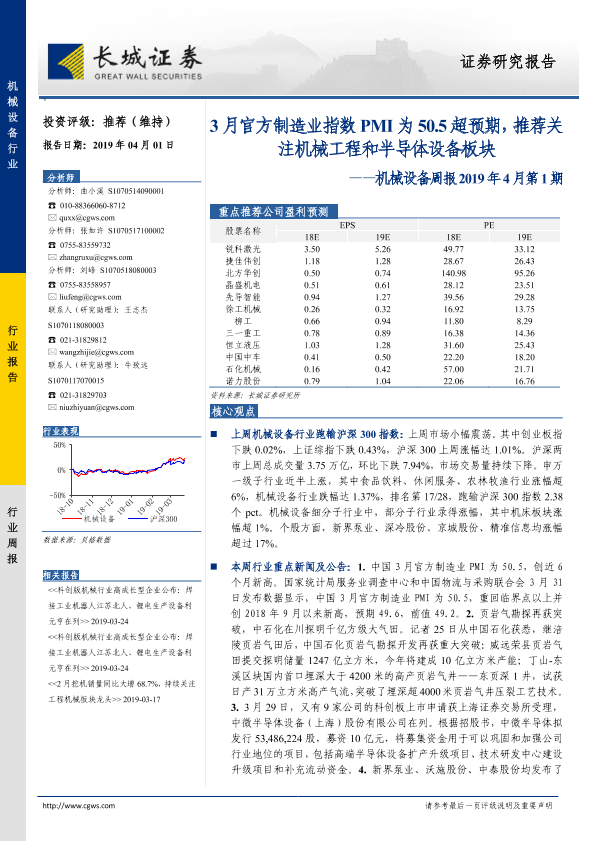 【长城证券】【20190401】机械设备周报2019年4月第1期:3月官方制造业指数PMI为50.5超预期,推荐关注机械工程和半导体设备板块-12页